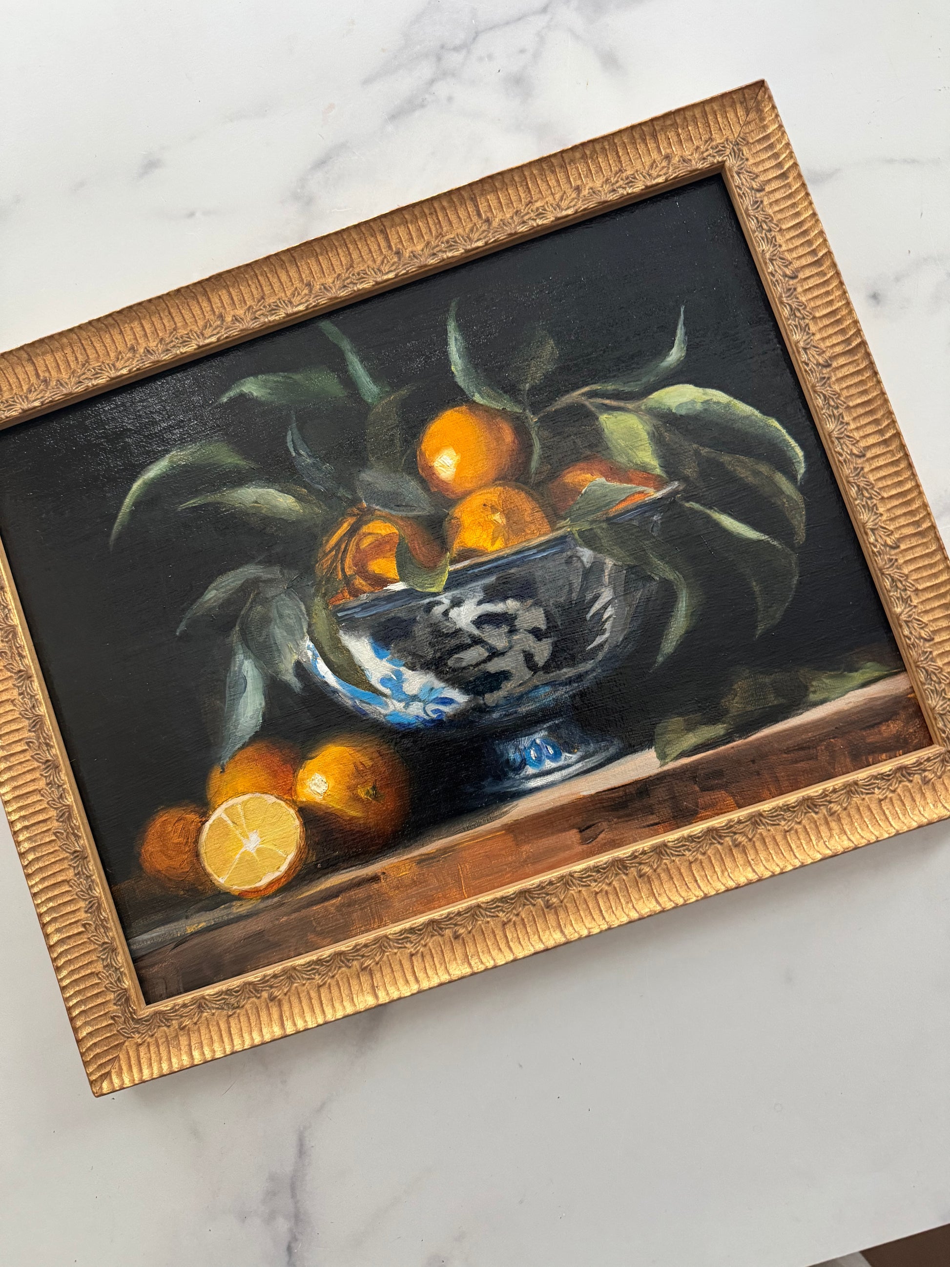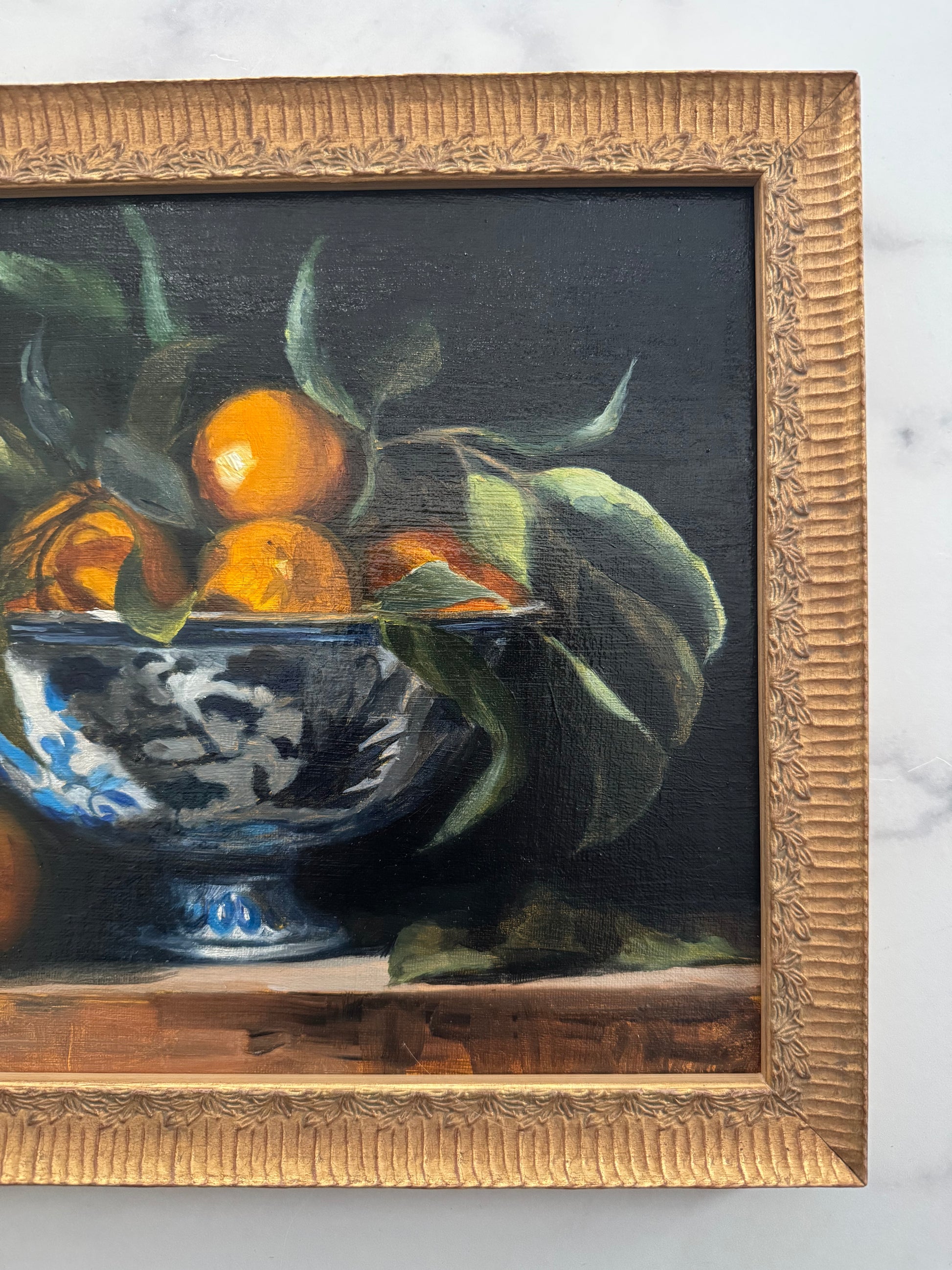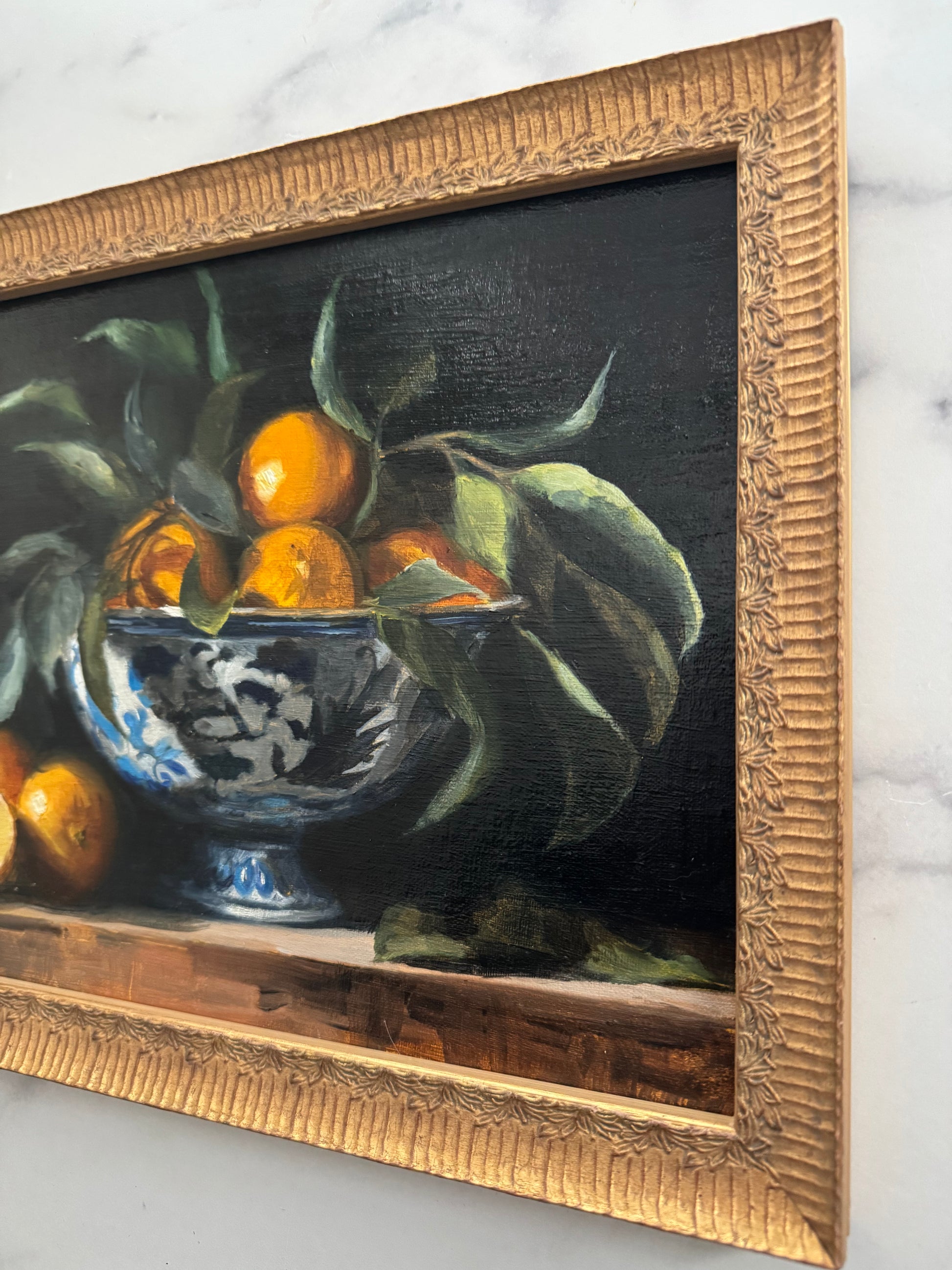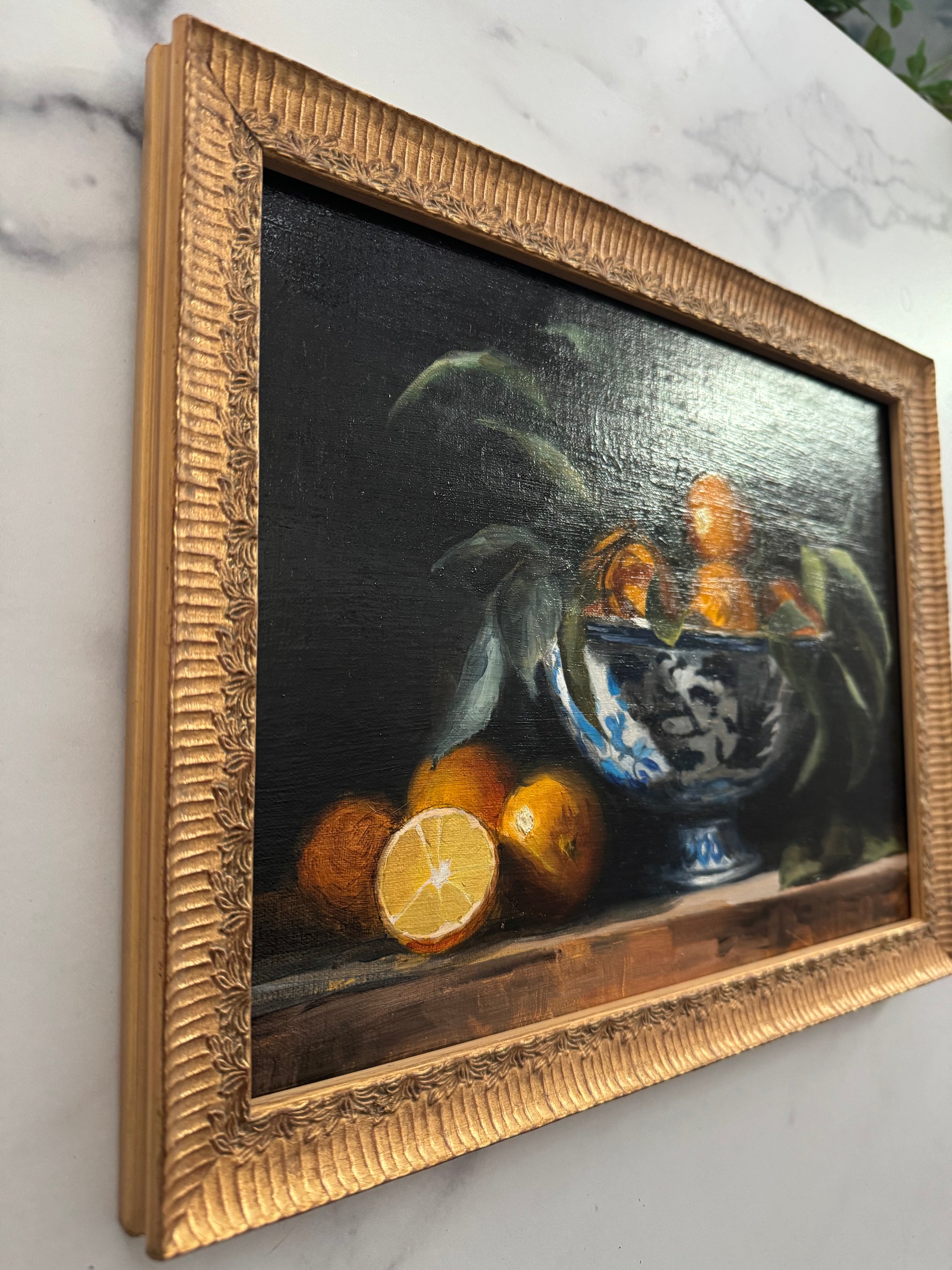 framed in an antique gold solid wood fluted frame with leaf details