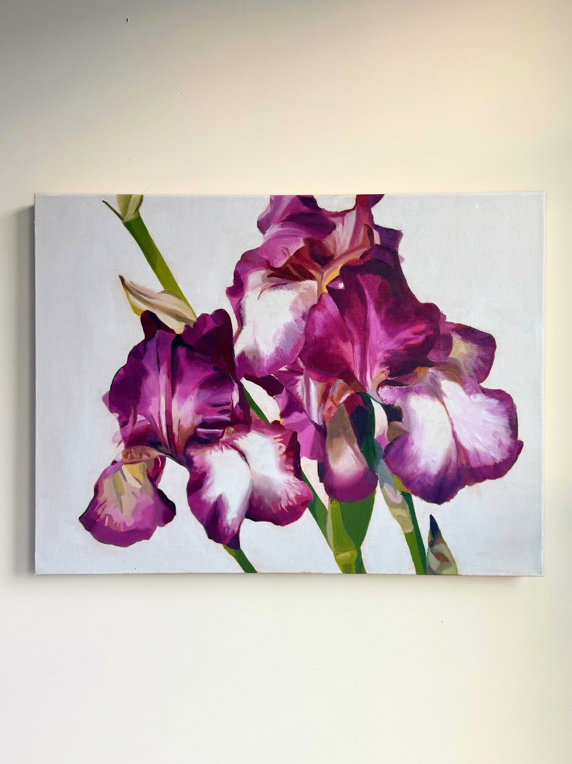 Three bearded irises rise against a fresh white ground, their violet petals unfurling with quiet confidence. Painted in oil with attention to form, texture, and light, this piece celebrates the sculptural elegance of the iris—each bloom both delicate and strong, poised in that fleeting moment just before full spring takes hold.